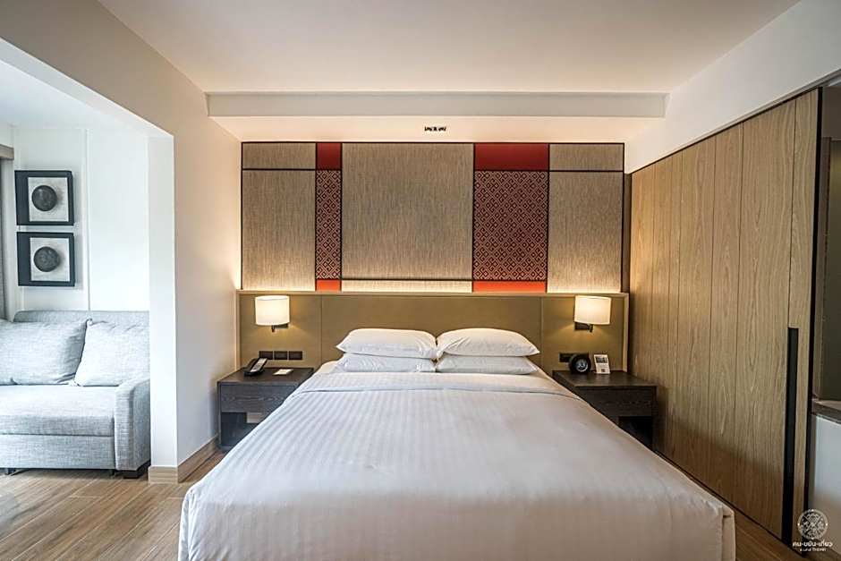 A 35-sqm room, including an additional 10-sqm outdoor patio on the first level with contemporary Thai décor features extended living area, one king bed, work area and elegant bath with sliding door and walk-in shower.